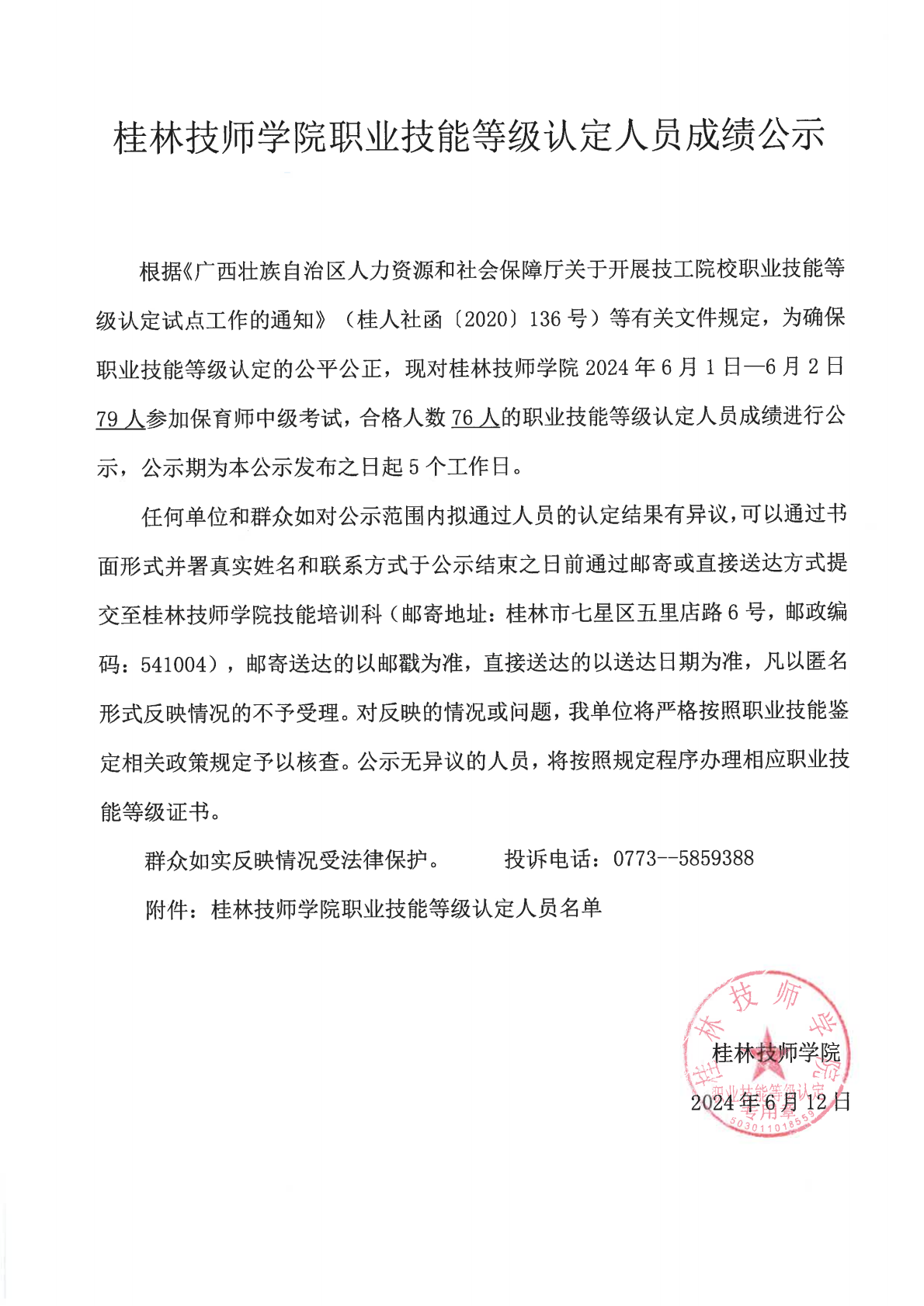 桂林技师学院职业技能等级认定240603S0000450310010002批次成绩公示