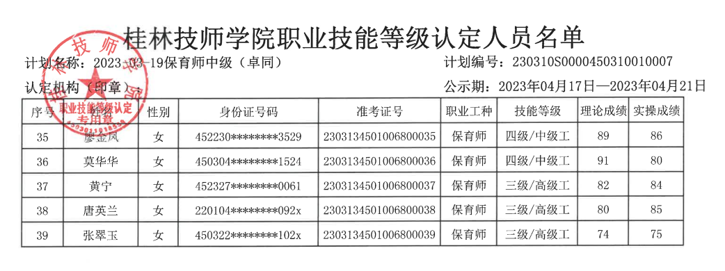 桂林技师学院职业技能等级认定230306S0000450310010007批次成绩公示