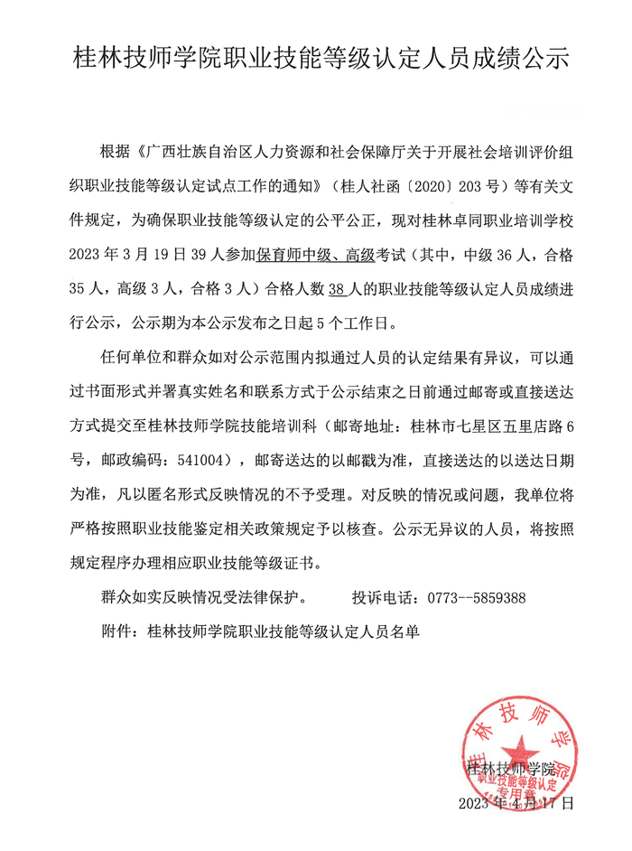 桂林技师学院职业技能等级认定230316S0000450310010010批次成绩公示