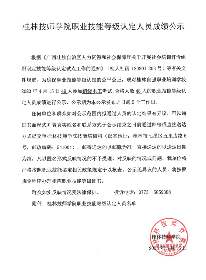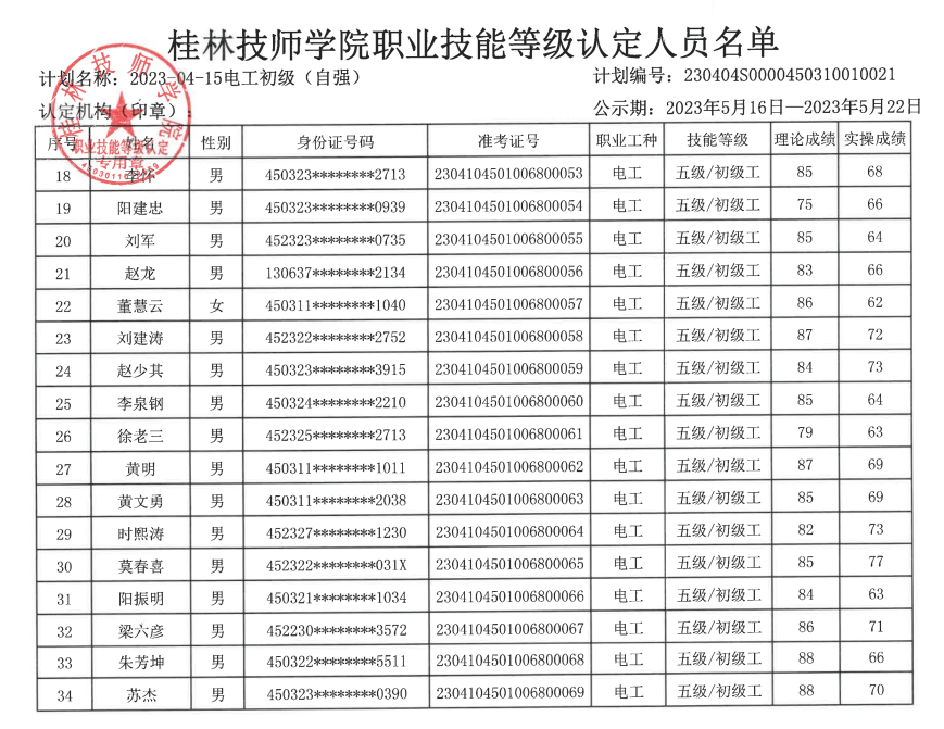 桂林技师学院职业技能等级认定230404S0000450310010021批次成绩公示