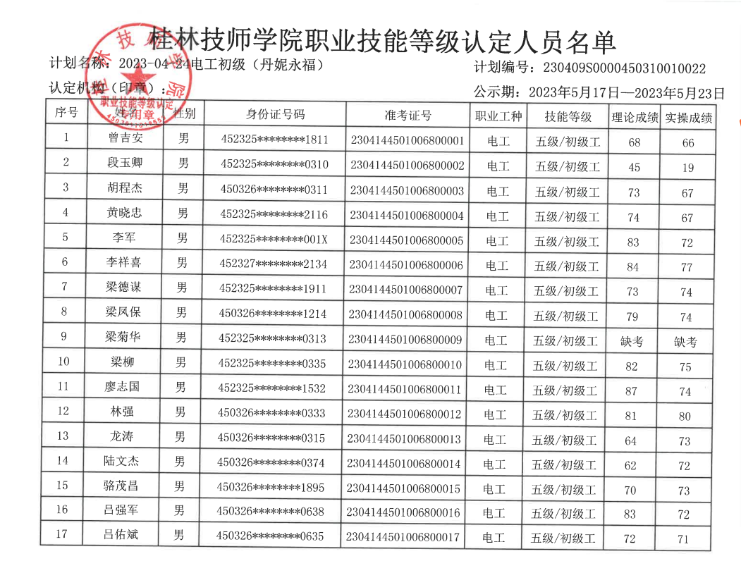 桂林技师学院职业技能等级认定230404S0000450310010021批次成绩公示