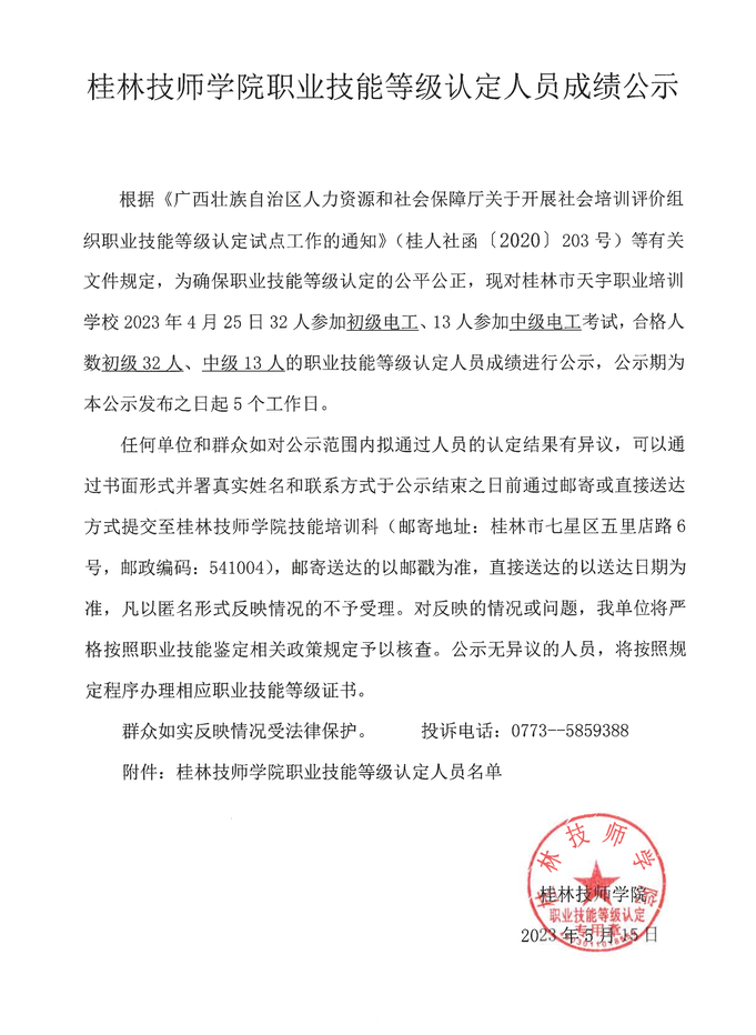 桂林技师学院职业技能等级认定230404S0000450310010021批次成绩公示