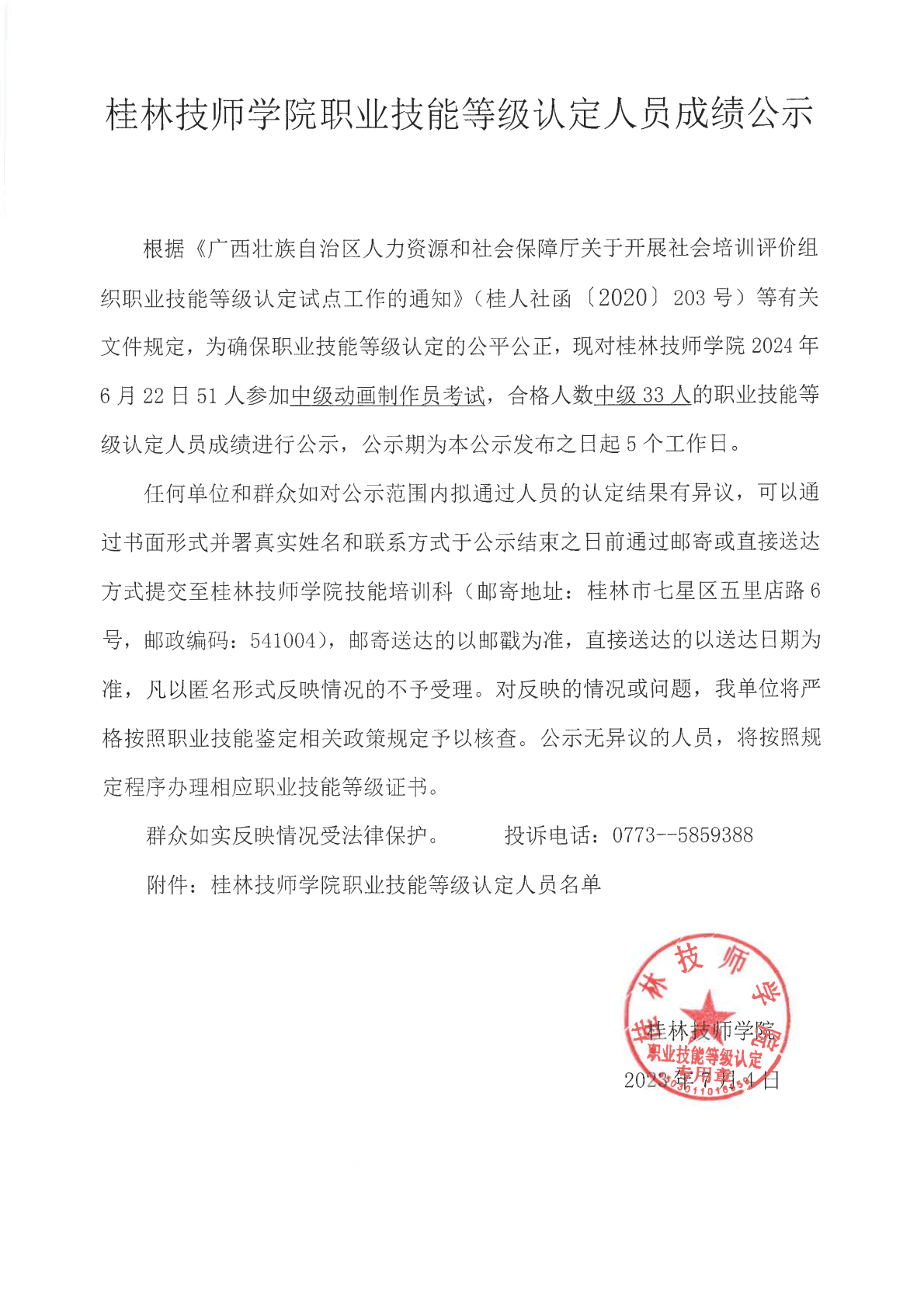 桂林技师学院职业技能等级认定240529S0000450310010001批次成绩公示