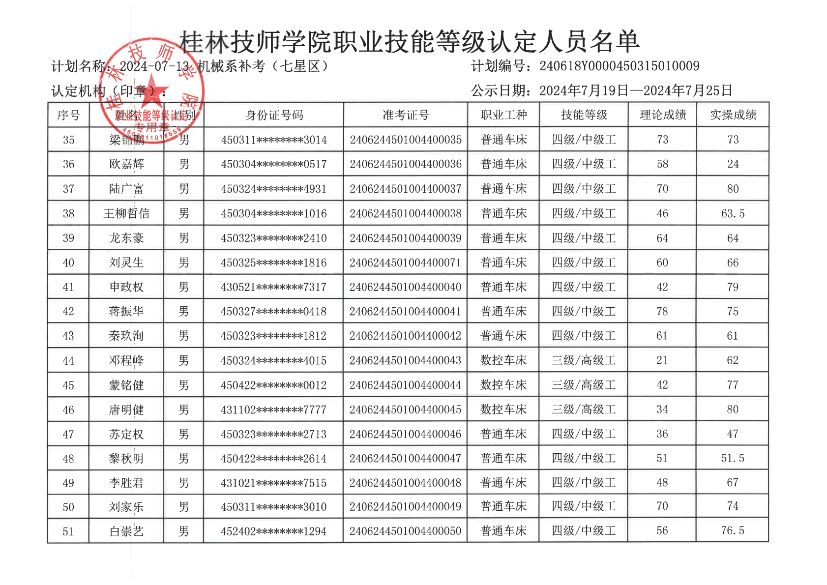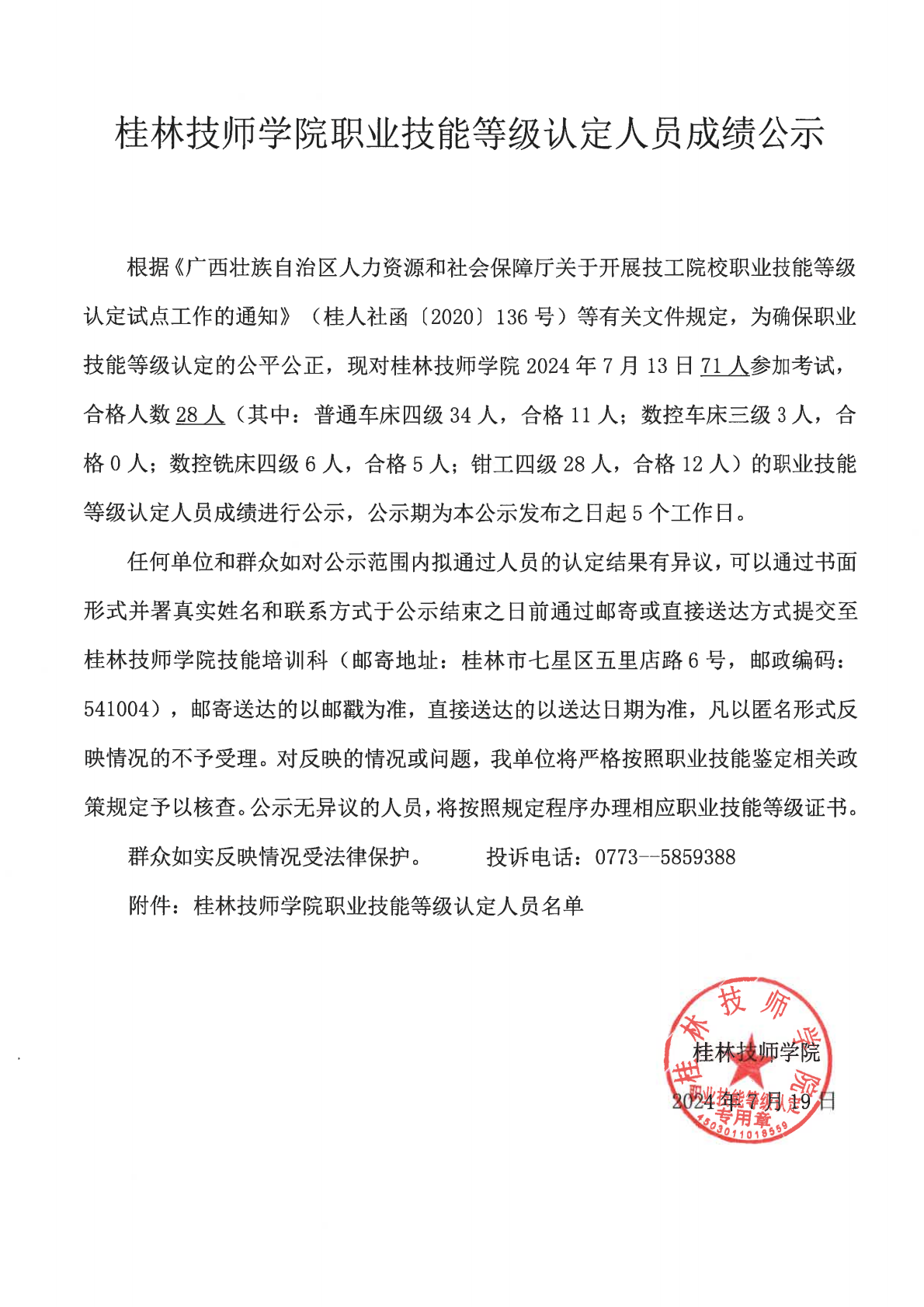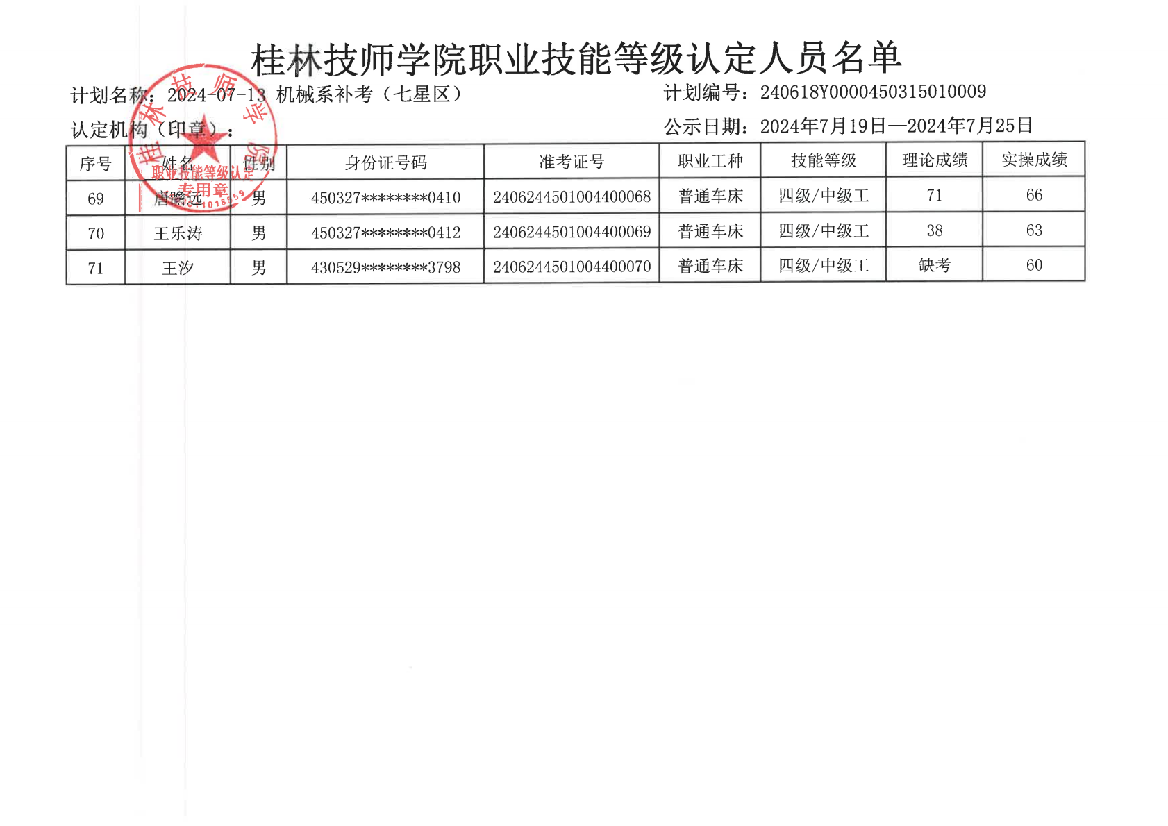 桂林技师学院职业技能等级认定240617Y0000450315010007批次成绩公示