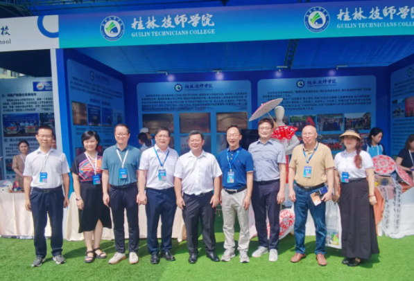 广西壮族自治区人力资源和社会保障厅技工教研室主任刘建成(中)、各兄弟院校领导嘉宾在我院展位前合影