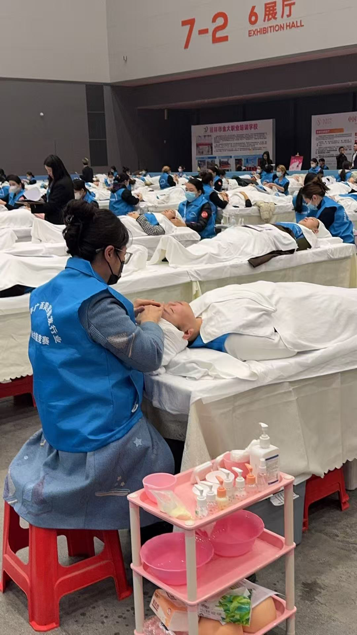 竞赛现场,旅游商务系美容保健专业师生团队凭借扎实的专业功底、规范的操作流程与创新的设计理念,在激烈的技能角逐中展现出良好的职业素养与精湛技艺。赛场之外,旅游商务系精心设计的“技艺传承·融合创新”主题成果展示区成为现场焦点。