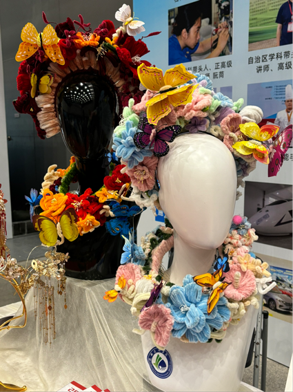 非遗技艺之新:一件件由师生联袂打造的簪花作品惊艳亮相,传统非遗技艺与现代审美在此碰撞交融,生动彰显了专业教学在非遗活态传承领域的探索成效。